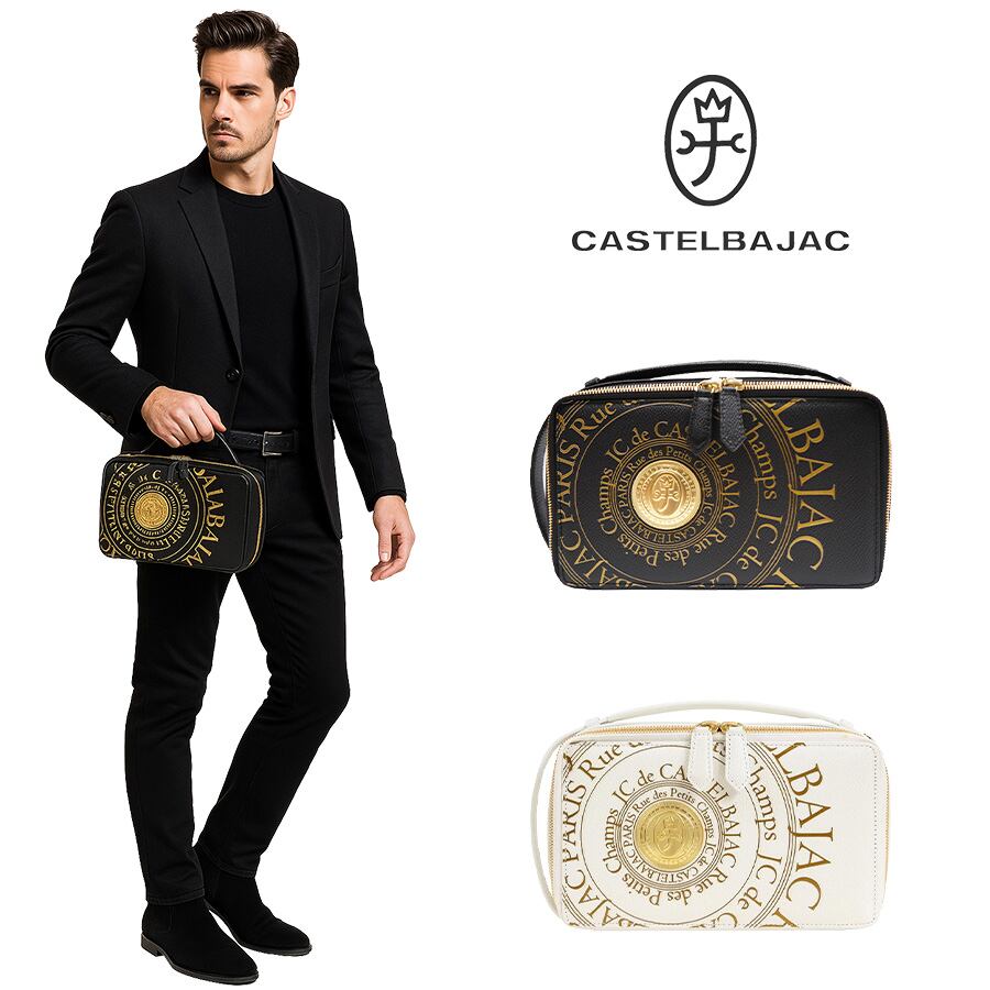 オールレザーの上質なメンズバッグシリーズ。フランスのコインをモチーフにした立体的なゴールドプレートと、その周りに施されたゴールドプリントがハイグレードな男らしさを演出するデザインです。